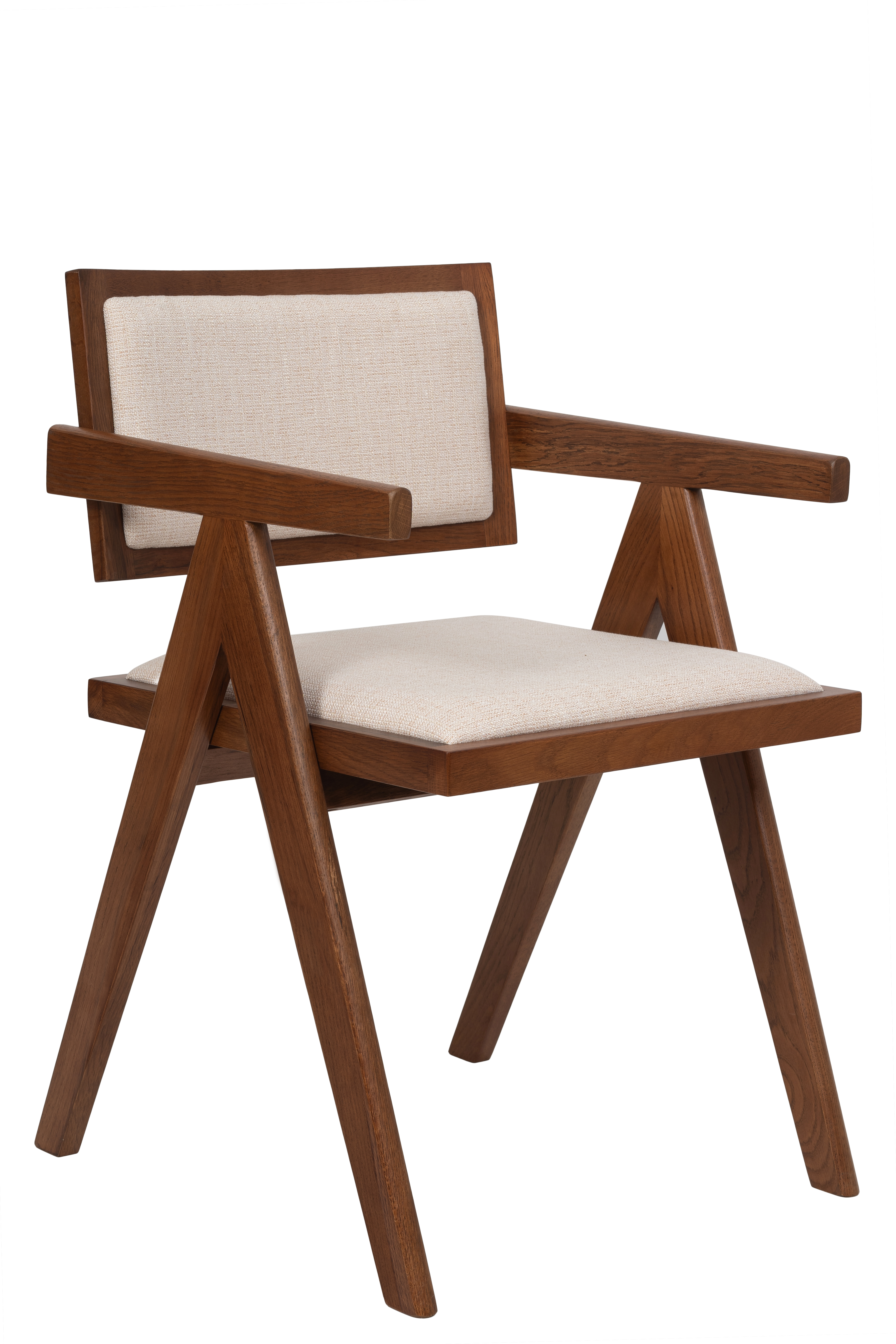 De fyra Sara karmstolarna tillför en tidlös och harmonisk känsla till helheten. Stolarna är tillverkade i FSC-certifierat massivt trä med valnötsfinish och har sits och rygg klädda i linnefärgat tyg som ger en mjuk, naturlig balans. Kombinationen av träets värme och tygets behagliga ton skapar en inbjudande och stilren atmosfär kring matplatsen.