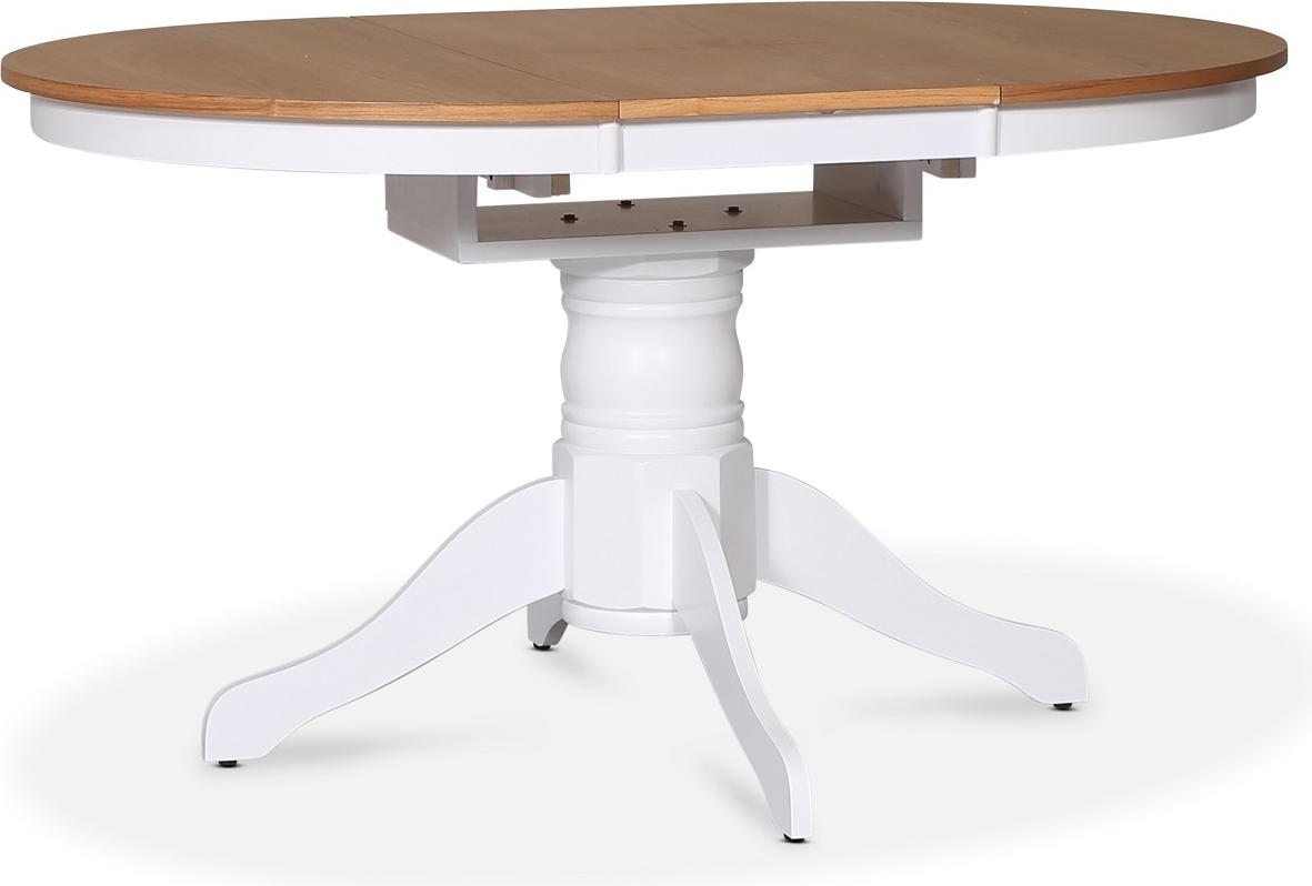 - Fitchburg matgrupp; runt matbord 106 /141 cm - Vit / oljad ek med 4 st Skagen stolar med kryss i ryggen, sits i grått tyg