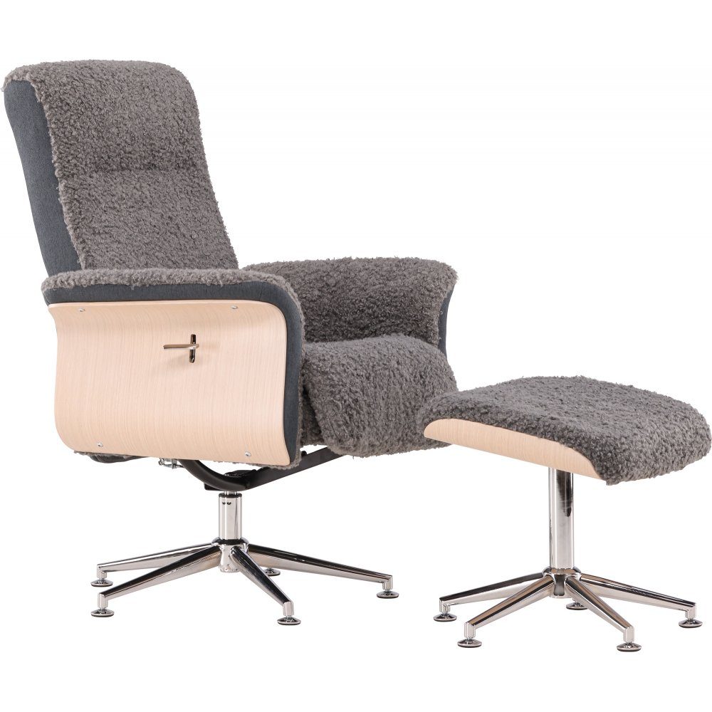 Här i grått teddy med trä på sidorna i vitpigmenterat ekutförande samt snurrbart stativ i kromad metall för att återge ett exklusivt utseende och känsla. Reclinerfunktionen går att ställa och låsa i olika ställningar. Matchande fotpall ingår.