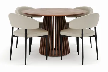 Noira Runt Litet Matbord Massiv Valnöt 120 cm med 4 Filip Matstolar, Brun / Taupe Bouclé