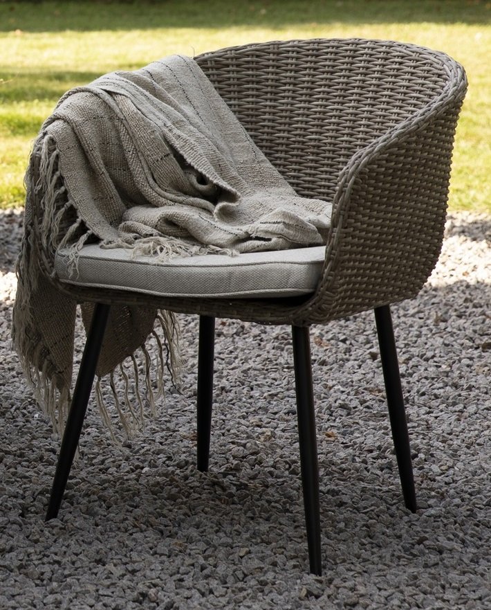 Utegrupp Aster: Scottsdale runt grå/vitt matbord Ø112 cm inklusive 4 st Aster karmstolar med sittdynor. En matgrupp i harmoni där möblerna går snyggt ihop och skapar en helhet som är svåröverträffad. Passar lika bra i uterummet som på gräsmattan.