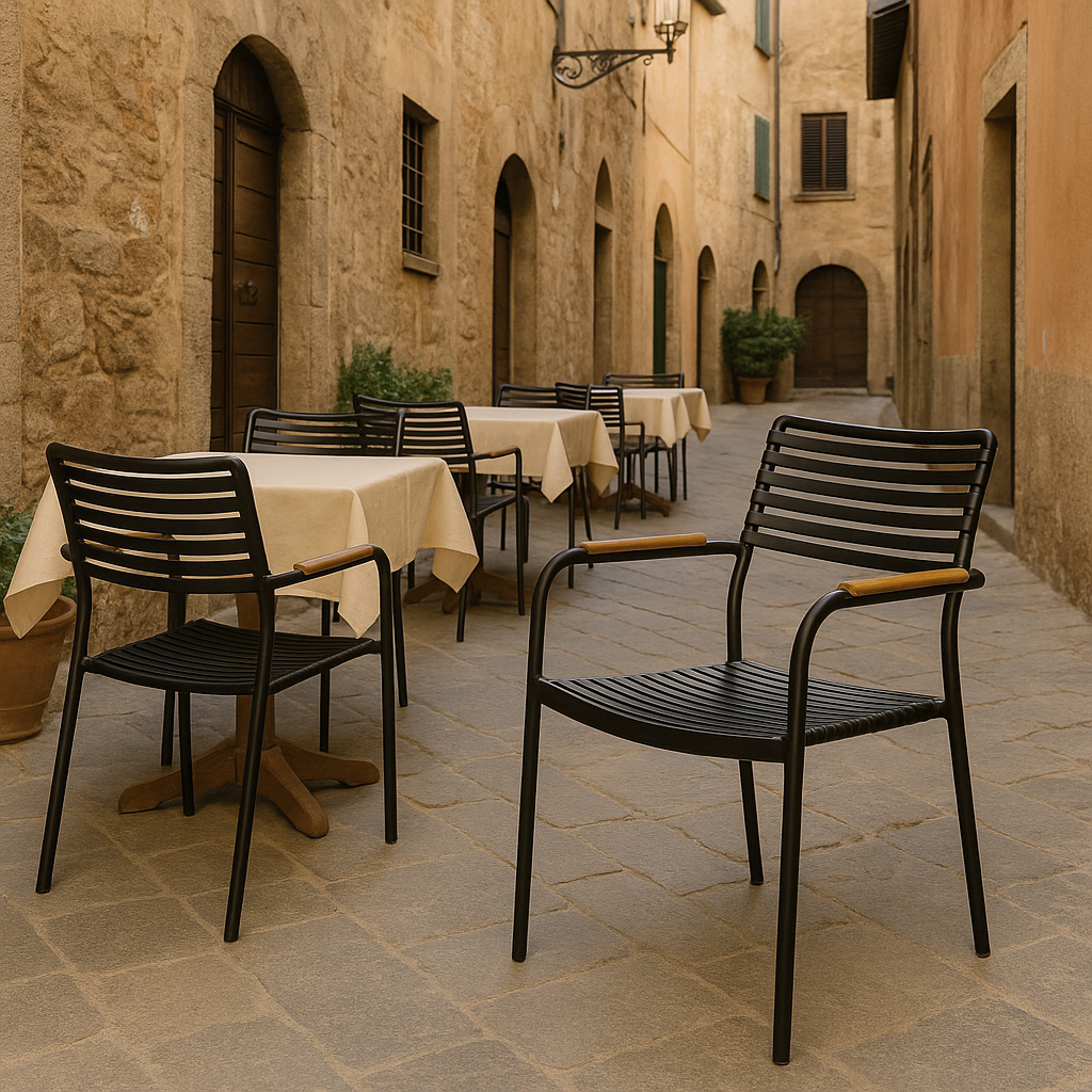 Pino-stolarna har en nätt, modern design och är enkla att stapla när de inte används. Stommen i svartlackerad metall kombineras med en tålig sits och rygg i noonwood-plast, vilket gör dem slitstarka och lättskötta. Tack vare materialvalen lämpar sig matgruppen väl för utomhusbruk under sommarhalvåret, med rekommendation att vinterförvara eller skydda möblerna vid kraftigt väder.