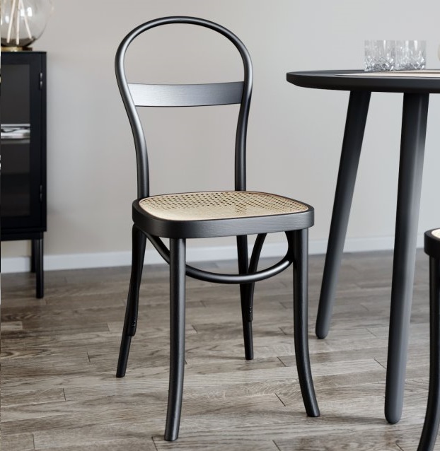 Skagen matgrupp från Skånska Möbelhuset, klassiskt matbord 140 cm med vitt underrede och en toppskiva i brunbetsad ekfanèr. Det ingår 4 stycken matchande Danderyd matstolar i svartlackad trä med rottingsits.