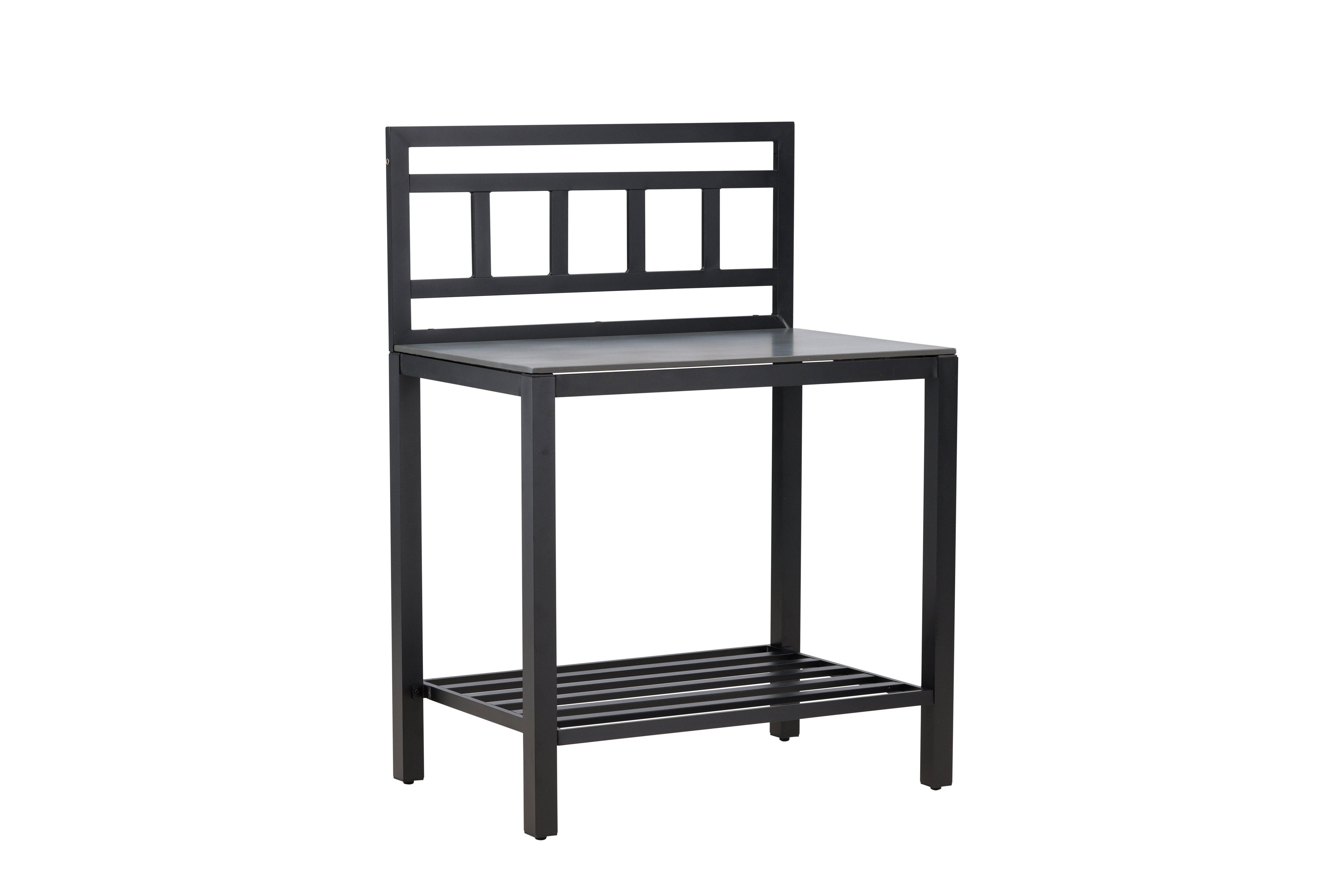 Tack vare hörnmodulen utnyttjas ytan maximalt och uteköket får en naturlig vinkel som gör arbetsflödet smidigt. Hyllplan under varje bänk ger gott om plats för redskap och tillbehör, så att allt finns nära till hands under matlagningen.