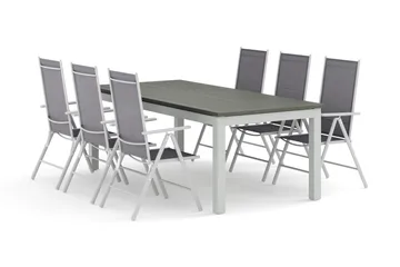 Tunis utomhus matgrupp förlängningsbart 205/305x90 cm med 6 Thor fåtöljer, Vit/Grå