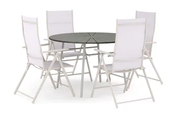 Tunis utomhus rund matgrupp 120 cm med 4 Thor utefåtöljer, Vit/Grå